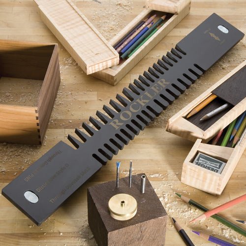 For years, dovetails have been a classic choice for joining medium and larger sized panels - this kit finally makes them an option for small-box projects as well! Create gorgeous 1/4" through dovetails with tight 1/2" or 5/8" spacing (on center) in stock ranging from 1/4" to just 1/8" thick. The set includes a template, two miniature 1/8" shank router bits, a reducer to adapt your router, and a template guide. Attaches quickly and easily to the Rockler Dovetail Jig.